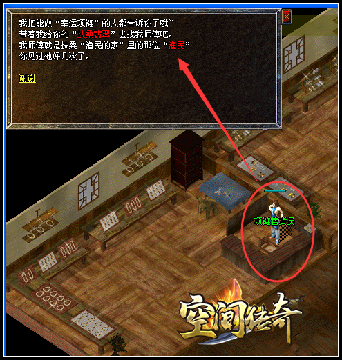 你根据你一路打听的消息,并且一路上获得了无数自助和宝物,最后你来到了“扶桑龙国”找到了扶桑国首饰店,见到了这里卖项链的一个女老板,你给了女老板10个元宝,女老板给了你“扶桑翡翠”并且告诉你,扶桑渔民是他的师傅,是一个制作“幸运项链”的高手。