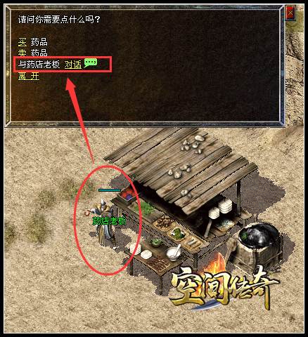 第二步、通过和张家布艺店老板的对话,你知道了关于至高圣衣的故事,你答应了帮助盟重省的人消灭六大魔王。你来到“土城药店”通过药店老板的对话,你知道了六大魔王的具体地址。
